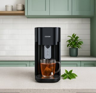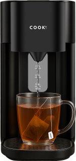Het compacte, moderne zwarte ontwerp (ongeveer 14 x 25 x 28 cm) en het lichte gewicht van circa 1,8 kg maken de dispenser geschikt voor kleinere keukens en kantoorruimtes. Houd wel rekening met de snoerlengte van 1 meter en het vermogen van 2200 W — plaats het toestel dichtbij een geschikte stroomvoorziening.