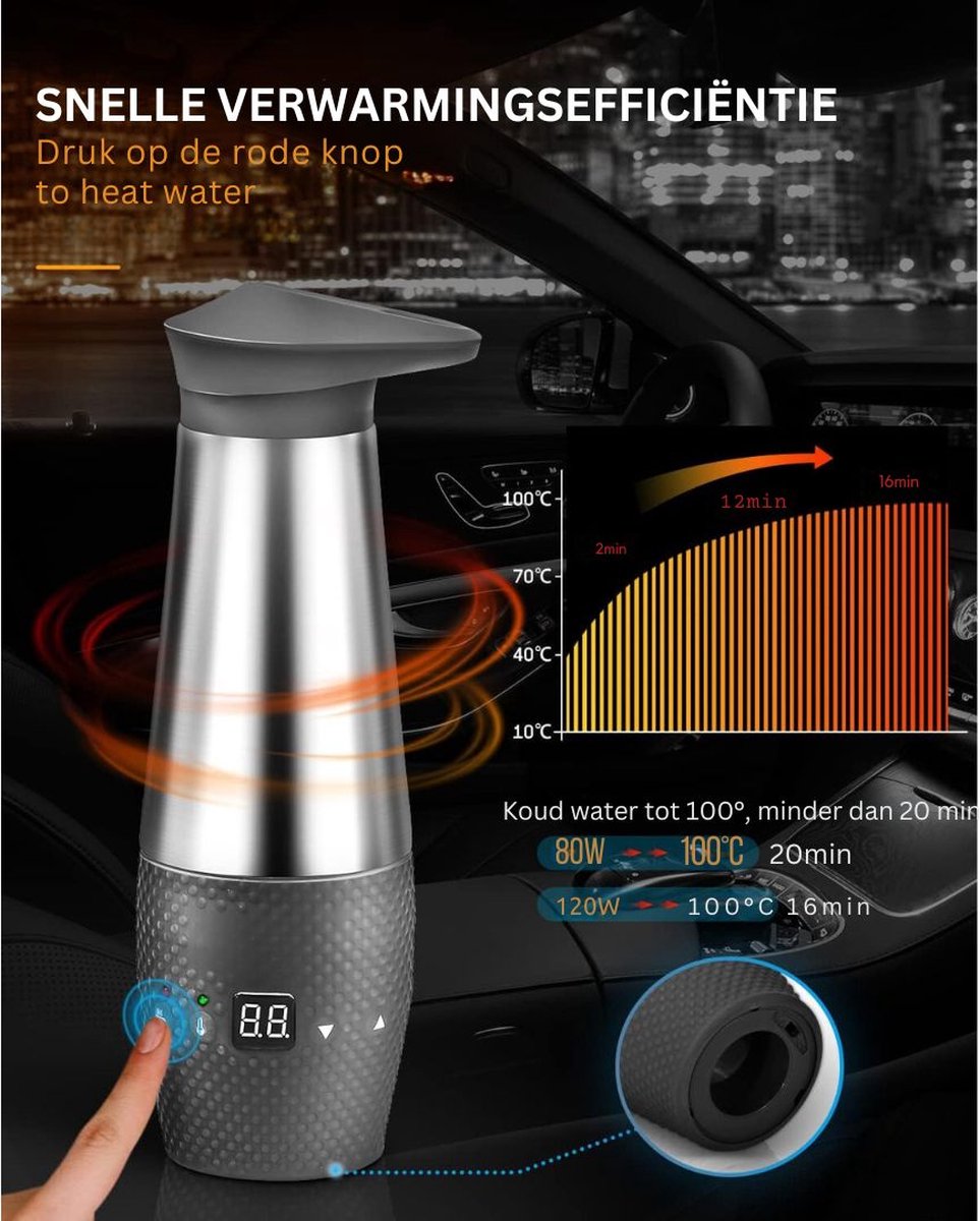- Gebruiksgemak voor onderweg: Sluit de waterkoker eenvoudig aan op de 12V-aansluiting (sigarettenaansteker), vul het reservoir met water en zet hem aan. Binnen enkele minuten heb je warm water klaar om te schenken.